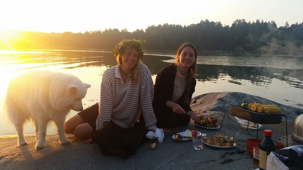 The only real expectation I had on midsummer’s eve was to successfully construct a flower wreath for my hair, be it made of flowers or seaweed. But it turned out quite a lot more memorable than that. The weather forecast had doomed our night with predictions of rain and horrible winds a day before we headed out, but when the day came, there was no rain to be seen. To my foreign friends I always explain that the midsummer celebration in Sweden probably can be considered just as important as the celebration of Christmas. It is a tribute to the the lightest night of the year – and the night really is a very light one. The sun dips below the horizon for just an hour or so, before coming up again, but darkness, there is none. Just a mild pastel colored light. All night long. Kristoffer, Katja and I headed out with our boat a little later than planned, but as a result we were completely alone in this almost magical grey landscape that seemed to be taken straight out of some Disney movie. Small granite islands passed on by as if they were floating on the water, and not the other way around. It was unreal. So beautiful. In time for our arrival to a tiny little island, the sun came out and we had our barbeque dinner and enjoyed midsummer’s eve like any Swede would. It was so warm I could even wear my dress whilst I was looking for flowers for my wreath. The sun set, and as we crawled into our sleeping bags we were all just so amazed at how perfect this midsummer’s night had been.